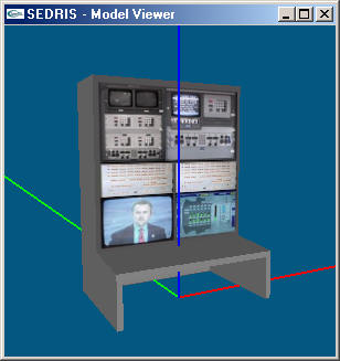 Information about the images and models being loaded from the SEDRIS transmittal are printed to stdout. Once the images and models are loaded, the viewer will open the 3D-view window and proceeds to sequence through and display all of the images loaded. After all of the images have been displayed, the first root model in the model library is displayed. The window then waits for user control from the keyboard. The 3D-view window can be moved, resized, minimized, and maximized. When the 3D-view window is selected, the models and images can be selected, viewed, and controlled via keyboard and mouse commands.